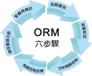 作業風險管理是一種連續性的程序,在加強執行績效與擴大作業能力時,設計用以識別、評估與控制風險。因為作業風險管理可在加強執行效力與提高作業能力時,提供一套識別、評估以及最終控制風險的基本架構。所有各層級的人員,可藉由作業風險管理程序以識別並控制危險因素。下圖是作業風險管理六項步驟程序之圖示。 |
